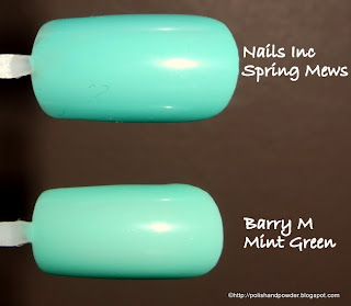 Spring Mews - this is a light mint green creme, incredibly close to Barry M Mint Green which is really only a shade or two lighter, so if you have that one, you don't really need this, though I do prefer the Nails Inc one as its more opaque.